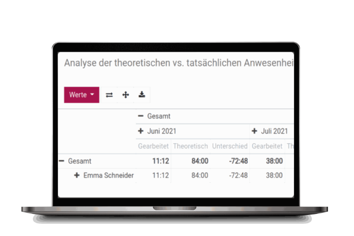 With our advanced attendance time comparison feature, compare actual worked hours against your company’s working time model.