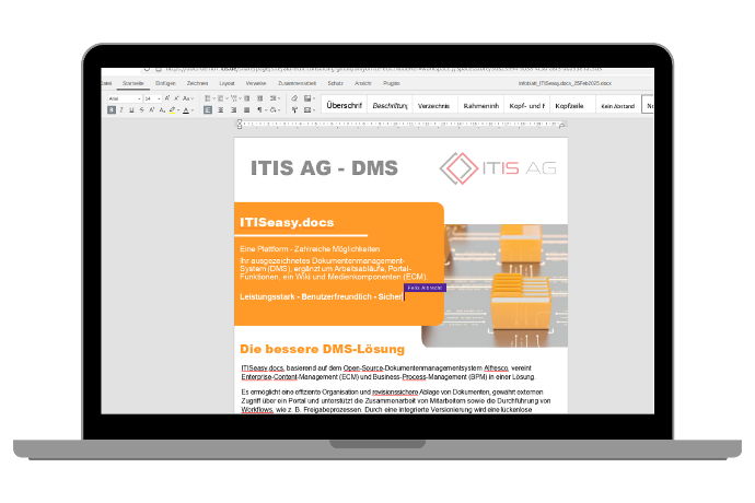 In your company's day-to-day business, teamwork on documents is mandatory. ITISeasy.docs allows several users to work together on one document. Every colleague with access can view common documents, make changes, and save the documents in a central location accessible to all authorized team members.