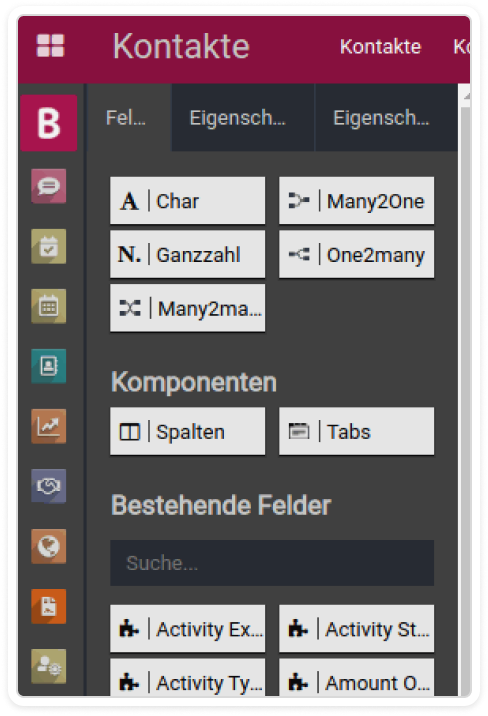 In the form view of a contact the following different fields can be inserted and changed:Char, Integer, Many2one, One2many, Many2manyIn addition the components Columns and Tabs can be added.